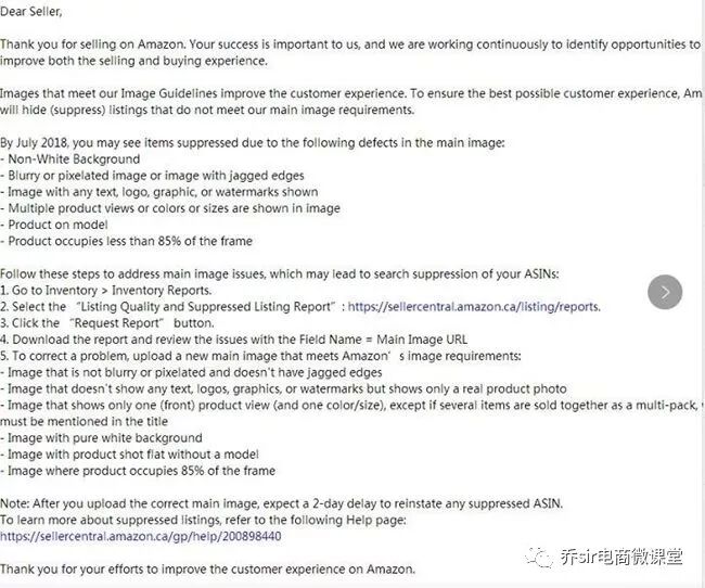 近日,有亚马逊欧洲站卖家向我们反映称:“收到亚马逊的邮件被告知将2018年7月份之后不符合平台照片要求的listing将被亚马逊强制清除。"