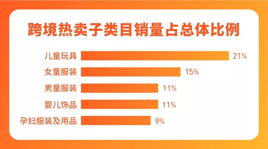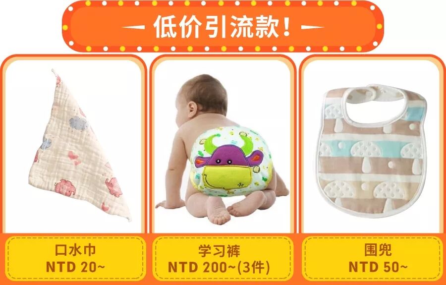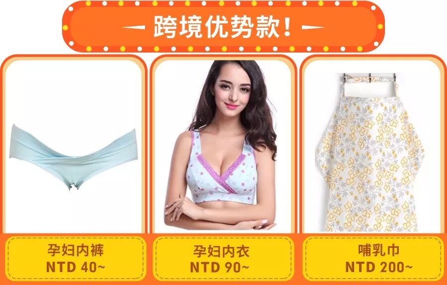 婴幼儿服装与配件主打口水巾、方巾等,可利用低价款引流;孕妇装哺乳内衣跨境有较明显的价格优势。