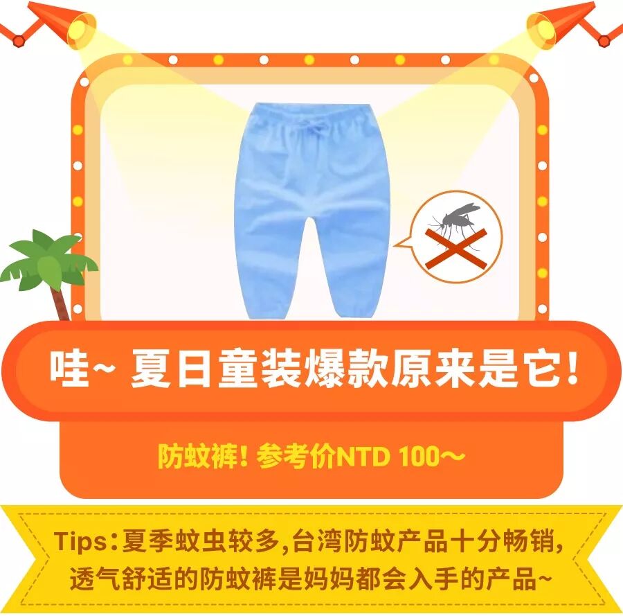 在台湾市场,除了防蚊裤,具有简洁卡通图案的儿童套装比较畅销,热卖款价位一般在NTD100以内。