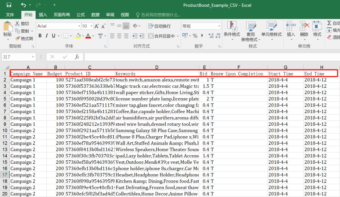 下载完成后,商户即可开始填写模板,模板中已经将必须填写的属性罗列了出来,包括:Campaign Name、Budget、Product ID、Keywords、Bid、Renew Upon Completion、Start Time和End Time8项,商户可以参考文件示例进行填写。
