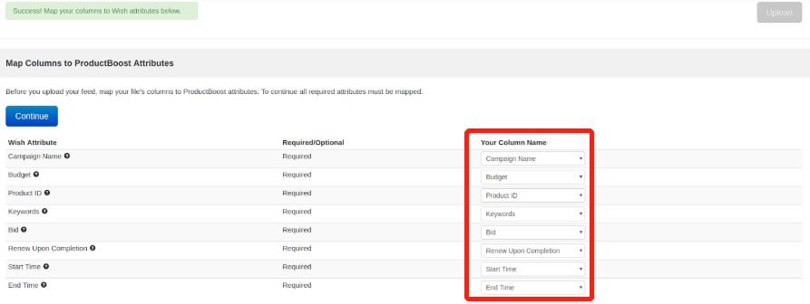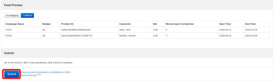 完成CSV文件上传后,平台将会核对文件内容,并标注有误信息以便您能重新修改提交。若CSV文件中所有填写信息有效,且满足以上所有要求,您将会看到成功的通知信息。同时你也可以查看系统对上传文件的列名称的映射是否正确,如有错误,可以手动调整。如果确认无误,即可点击“继续”,进入最终提交环节。