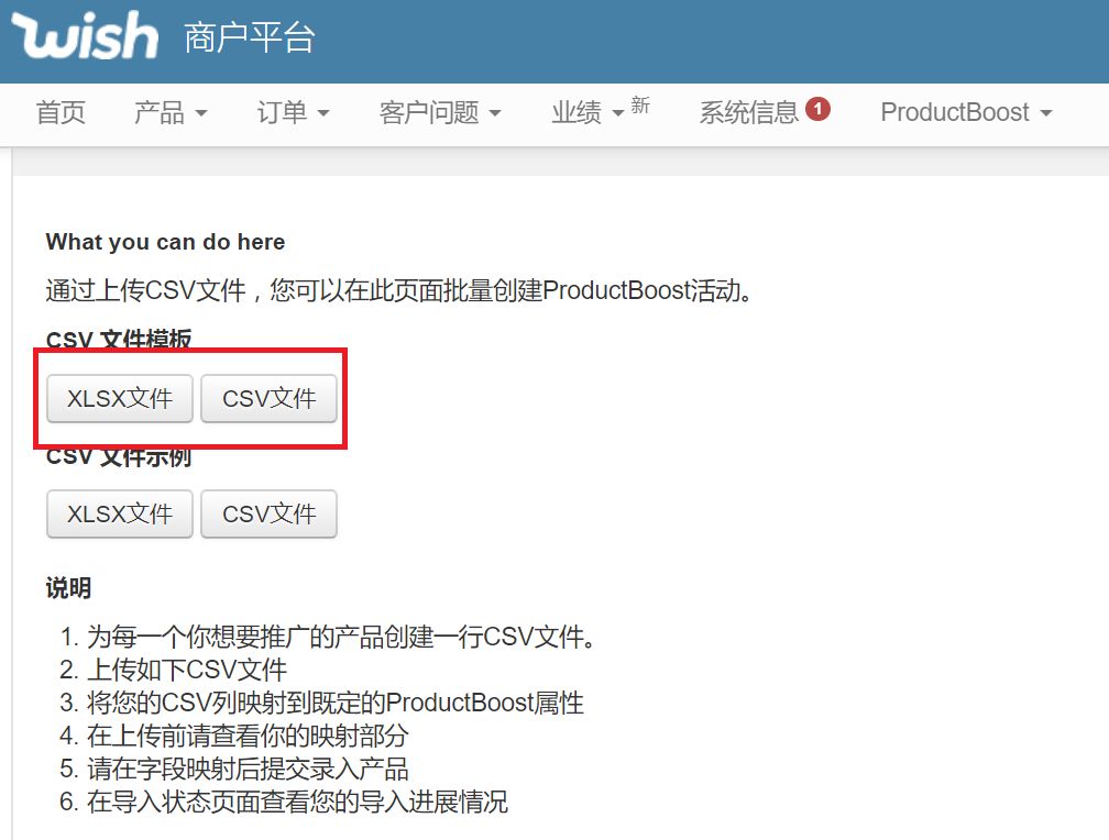 还记得如何在Wish商户后台设置ProductBoost活动吗?可以点击这里查看,现在除了通过后台一步一步设置PB活动外,还有一个批量设置多个活动的方法,操作也是非常方便简单。