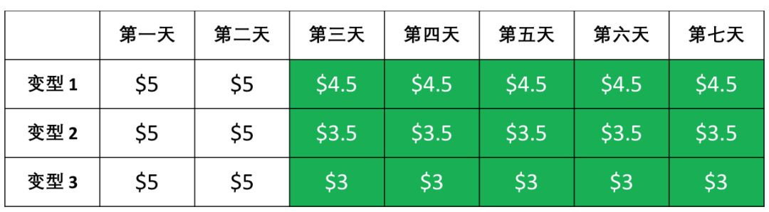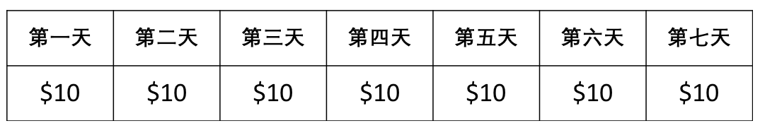 前2天的每日最低价是$5,后5天的每日最低价是$3。