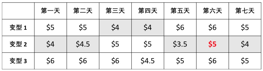 产品7日内的每日最低价分别是:$4, $4.5, $4, $4, $3.5, $5, $4。