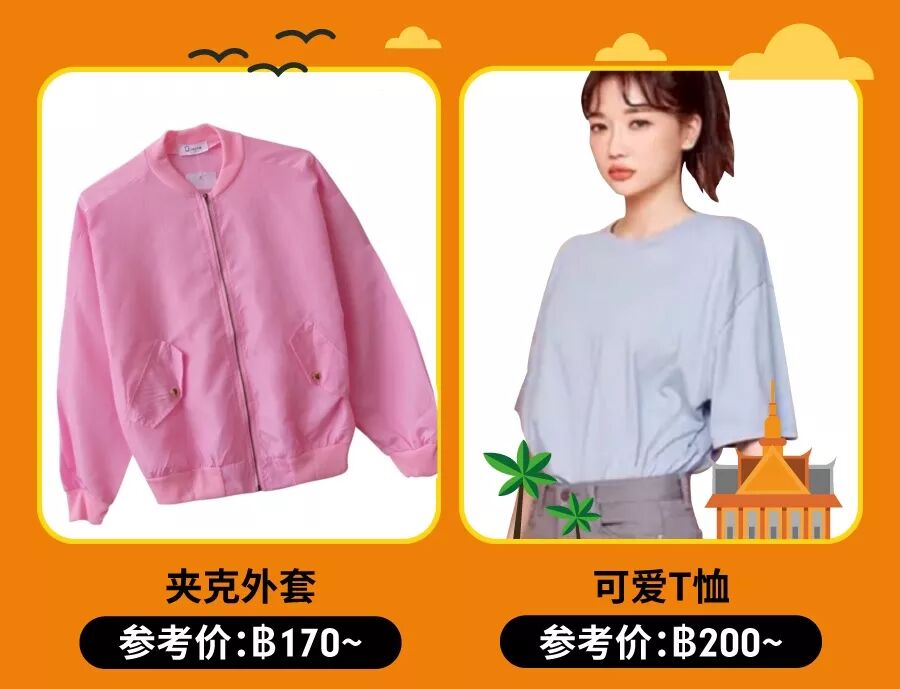 女装近期热卖商品为夹克、短袖T恤等,颜色选择较多,价位在两百泰铢以下。时尚、有质感的首图非常重要,可以大大提高商品点击率!另外,卖家要注意将所有颜色都在图片中展示出来哟~