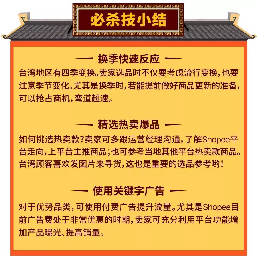 该台湾店铺主营女装,单量从2017年11月开始较快增长,从日均两位数涨到三位数。它主要是在台湾气温开始降低时,先选择长袖衣服铺货,然后用Shopee付费广告引流,同时配合全场最低价,把流量的留存率发挥到最大。