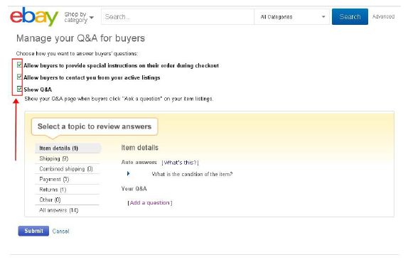 如您希望买家在点击刊登中的“Ask a question/询问卖家问题”时显示“Q&A/ 问题与回答”页面,可点选【Show Q&A】【图2】。