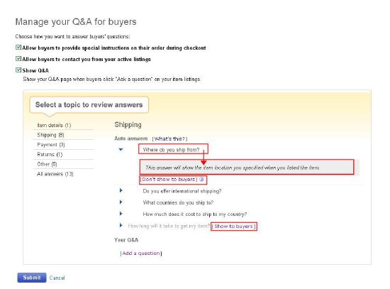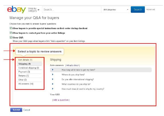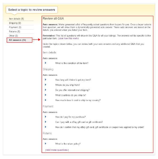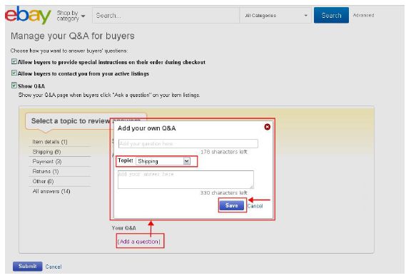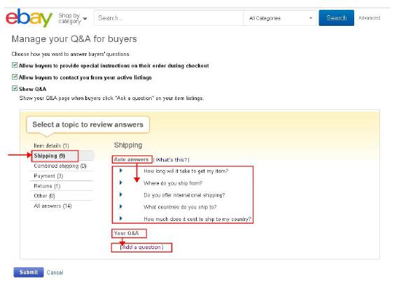 第六步:如需要设置问题,例如:物品的运费问题,可点击“Select atopic to review answers”区域左侧边栏的【Shipping】即可。点击“Your Q&A“下方的【Add a question】,可创建问答【图4】。