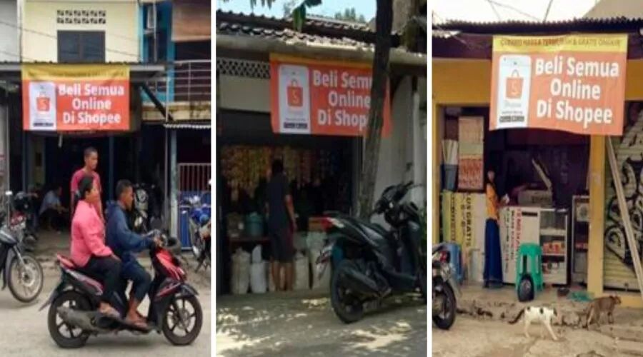 除了城市,Shopee也大面积渗透了印度尼西亚的乡镇地区,在中小商铺门店张贴横幅广告,十分接地气!