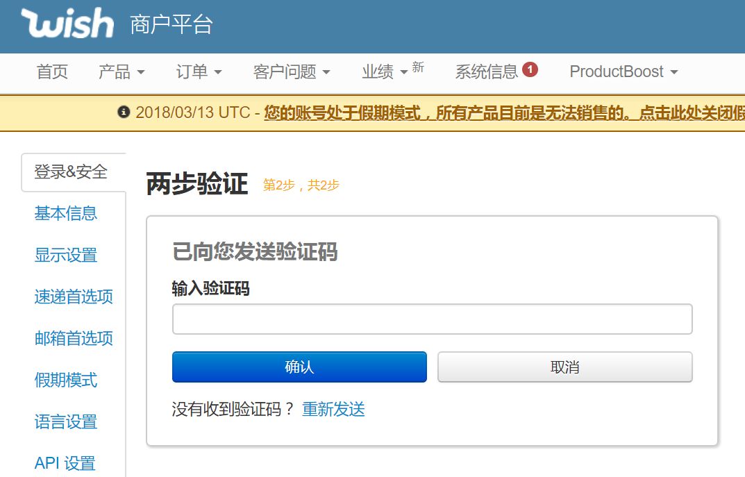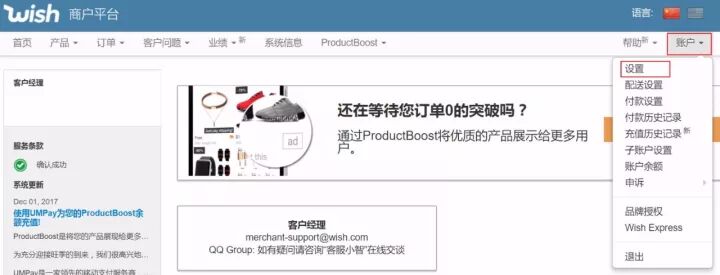 登录Wish商户后台,进入设置页面