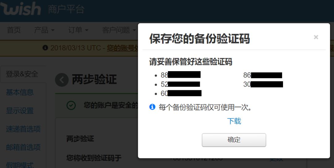 这个悲伤的故事原本可以避免,只需要简单的一个操作——两步验证。开通“两步验证”后,当Wish账号要登录到新的设备、修改支付信息、修改预留的手机号码等情况时,都需要短信验证通过,才能成功继续进行。简单的一个操作,就能极大地减少被盗或非本人操作所带来的损失和风险。