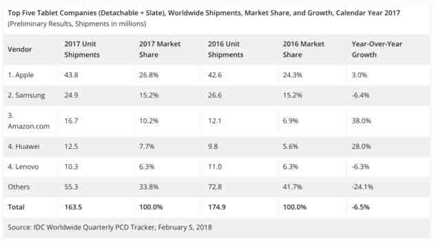 上一季度平板电脑出货量同比下降7.9%。下面看看2017年的出货量和市场份额(注意亚马逊38%的销量):