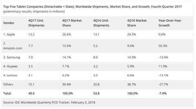 研究公司IDC发布了新的平板电脑市场数据。根据VentureBeat的报道,亚马逊在2017年第四季度销售了770万台平板电脑,首次跃居三星(700万美元)之首。