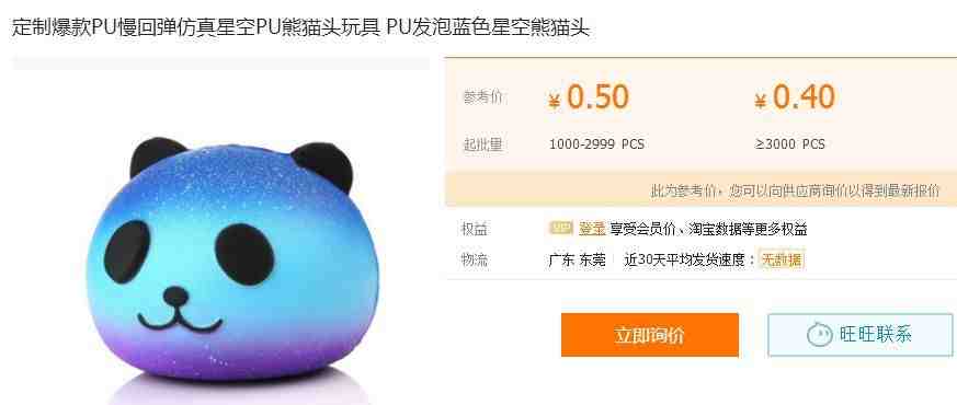 小编前往1688网站进行搜索,发现此类玩具价格真的是极低,以蓝色星空熊猫头为例,3000件以上的价格是0.4元。