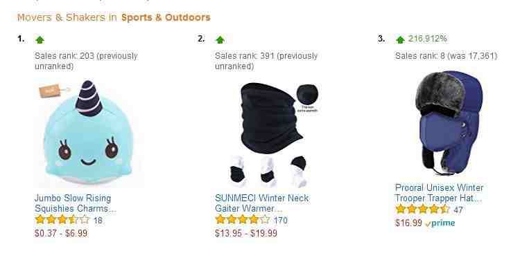 在亚马逊“Sports & Outdoors”飙升榜单中,这款产品直接爆表,数据统计直接都统计不到了,因为增长太过迅速。从下图的榜单截图可以看出飙升幅度肯定超过了排名第三的冰雪天神器“火车头帽子”,这款帽子的数据是216912%。