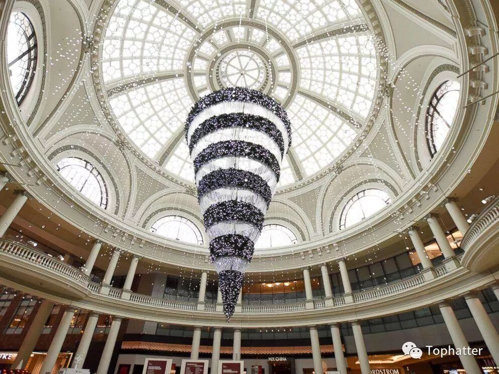去年圣诞季,旧金山的Westfield购物中心在其商场的圆顶内首次展示了一个50英尺高,30英尺宽的枝形吊灯般倒挂的圣诞树,今年他们将继续沿用倒挂圣诞树。