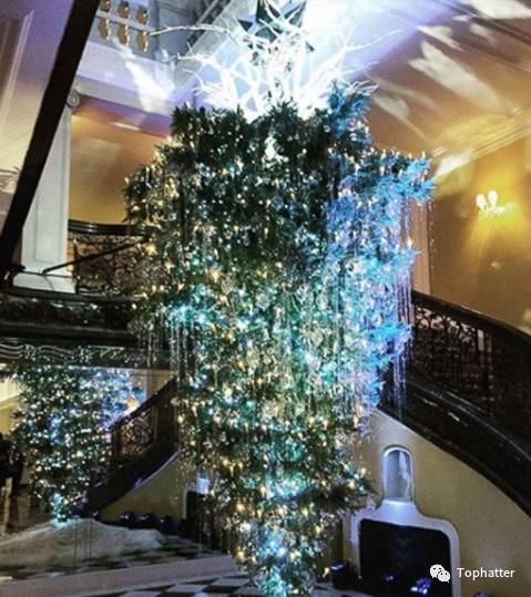 时髦的倒挂圣诞树近年来引起了人们的关注,伦敦Claridge酒店也采用了流光溢彩的倒挂圣诞树进行装饰,现在,美国各州也越来越多人开始关注的这种节日装饰。