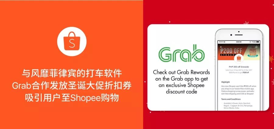 除了推出系列预热活动,Shopee还与Grab、可口可乐、Foodpanda、Takatack Zenrooms和Seaoil等各大品牌伙伴强强联合,借用品牌在菲律宾全国的用户资源为圣诞大促引流,开启流量大爆炸模式!