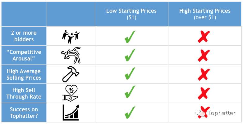 作为卖家,设置1美金起拍可以邀请到更多的买家一起来参与竞拍,最终购买你的商品。这不但不会拉低你的最终成交价,相反,最终售价往往比你期望的价格高很多。