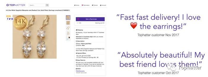 从Folks Jewelry在Tophatter上线以来,有上万个买家在他们店铺里享受竞拍的乐趣。上图是几个买家关于在Tophatter上的购物体验分享,他们说:“到货很快!我很喜欢这耳环”;“太美了!我最好的朋友非常喜欢!”