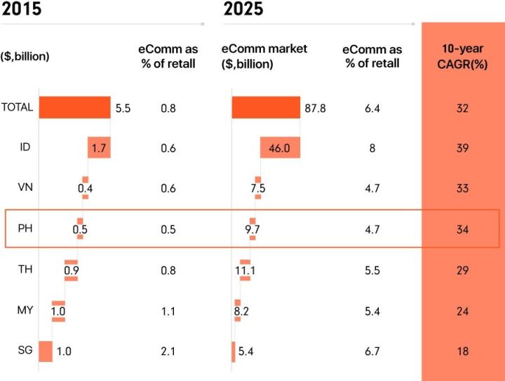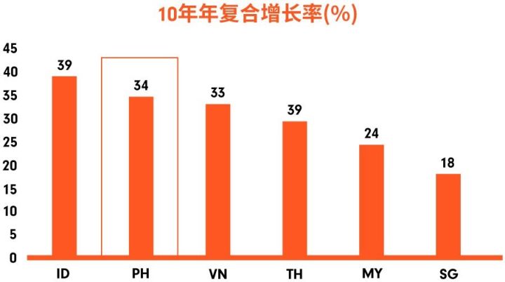 菲律宾电商市场2015至2025年的年复合增长率高达34%,增速仅次于印尼市场,位居第二。