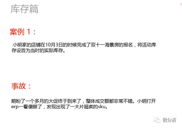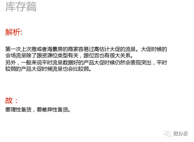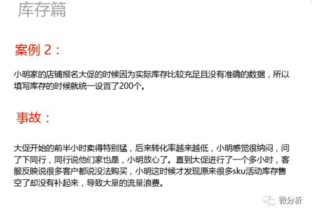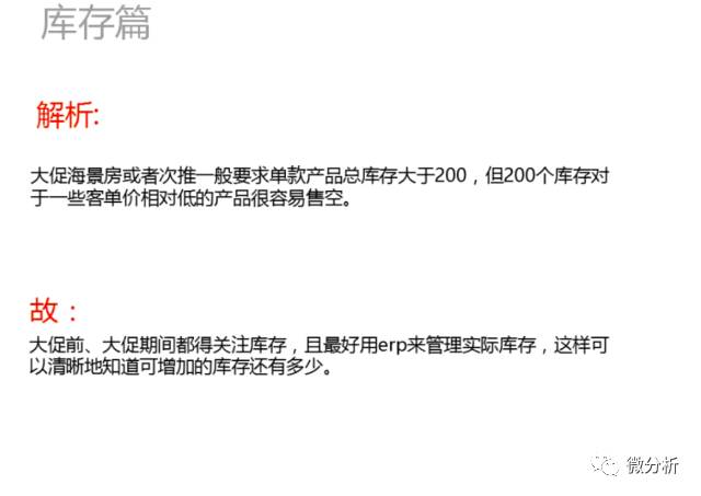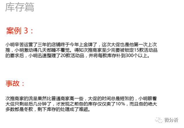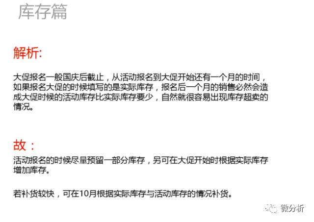 双十一绕坑攻略之库存篇 这里需要先搞清楚两个概念:活动库存和实际库存。 全店铺打折或日常售出的产品扣减的就是实际库存,限时限量折扣或者平台活动售出的产品扣减的是活动库存(下单减库存) 案例一 绕坑攻略: 1.十月是销售旺季,不能有多少实际库存就报多少活动库存,需要预留一部分库存用于大促时根据实际增加库存。 2.根据补货周期提前核对库存,不够再补。 案例二 绕坑攻略: 即使是爆款产品在大促时也不能全部售出,因为产品一旦售空但未能及时补货,会导致进退两难的境地,只能作下架处理,而爆款一旦下架则很难再“爆”起来,因此恰当的做法是预留一部分实际库存用于大促后度过产品的补货周期,这样既不用面临售空下架的尴尬,也保持了爆款的生命力。 案例三 绕坑攻略: 1.对于金银牌卖家来说,新加入的金银牌卖家需要理性对待平台次推和大促备货,因为根据千人千面和赛马机制,新加入卖家缺少优质数据的积累,很可能会排到很后面,那么分到的流量也会随之减少,因此需要冷静理性分析自己所处的行业位置,合理备货。 2.一般来说,平时流量数据好的产品大促时仍然会表现突出,数据不好的大促时流量也会较弱。 总结 做生意最讨喜的一句话就是“货如轮转”,这其中也蕴含了本次课程中关于库存的一些理解,货物和钱一样,要不停地流转才能产生新的价值,因此最怕的就是“停滞”和“不通畅”,本次的三个案例中,案例一的主角在设置库存时忽略了10月份的销售额,因此最后库存超卖,导致发货停滞,这是坑之一;案例二的主角没有认真核对库存,随意设置,最后虽然大卖但是库存早已售空,白白浪费了大促流量,导致销售停滞,这是坑之二;案例三的新晋金牌卖家高估自己的行业地位,备货过量,最后流量不足以消化那么多库存,导致仓库周转停滞,这是坑之三。 希望广大卖家看了这篇库存攻略之后在今年大促一定要避免这些问题,最后祝各位货如轮转,双十一大卖!