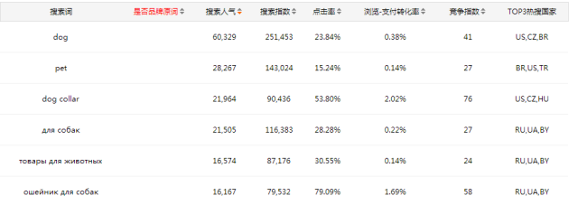 核心观点: 1.澳大利亚和美国是养宠物的大国,二者在宠物的开销越来越大,为速卖通平台的卖家提供了很好的销货渠道。 2.狗牵引绳在养狗用品中占据偏大,而猫牵引绳市场似乎在崛起。 3.具有特定功能的产品需要做好产品描述,让买家能够完全了解产品才更易于下单。 4.在主图中珍惜每一张图片的位置,简单扼要地指出产品、尺码、特点等。 5.新店更应该通过值得信赖的品牌,优秀的质量,贴心的服务来赢得销量。 以下为正内容 从外媒近日的报道中了解到,由于宠物主人总是寻找各种新产品来获得对宠物的喜爱,澳大利亚两大宠物用品公司开始争夺迅速崛起的宠物用品电商市场。澳大利亚是全世界收养宠物率最高的国家之一,宠物用品电商市场交易额达80亿澳元。宠物消费市场的需求也非常大,适合发展电商:一只成年拉布拉多猎犬每月可吃掉25kg食品,这个食量有可能保持八年,直到转入老年饮食阶段。 与其在超市货架上寻找猫砂或治疗跳蚤的药物,还不如陪宠物去公园玩儿投球游戏。在网上浏览订购宠物用品,那些大而笨重的宠物商品还可以直接配送到家门口,将会方便很多。可见宠物用品电商市场越来越风靡,今天我们来聊聊宠物用品之牵引绳。 1.产品概况 筛选方式:输入搜素关键词后根据Best Match的顺序选择关于Leash的产品9个。 搜索产品汇总: 从上图我们可以得知,此次竞品分析主要以牵引绳为主,有一部分是较为复杂和完整的产品1,产品3,产品5和产品6,剩下的是简易设计构成的牵引绳。哪种更符合买家的需求,哪种产品的特色更能吸引买家?我们下面进行全面的分析。 2.行业概述 1.牵引绳流量占养狗用品的比值最大,供需指数偏大,竞争激烈。 从上图的牵引绳行业数据可以看出,对比与同级类目的39个类目,其占比最大且是主要的类目。在牵引绳的上一级类目——养狗用品中,浏览量是最大的类目,证明狗牵引绳是外国买家进行国外网购的主要产品。相对于偏贵且款式选择性低的国内门店,买家还是愿意进行跨境网购。 供需指数是指统计时间段内行业下商业指数/流量指数。供需指数越小,竞争越小。从上图看出,狗牵引绳的供需指数很大,相比于其他类目不超过100%的供需指数,狗牵引绳明显是竞争激烈,供过于求的。在其流量指数也偏高的情况下,供需指数偏大,证明速卖通平台上的商品很多,新卖家进驻需谨慎。 在狗牵引绳的行业趋势访客数占比图中,在每个月都有一个访问的高峰期,且在8月由于大促的原因,高峰期出现在后期,其访客数与上文说的一般,都是在上一级类目中处于交易量较大的类目。 由于分析的产品中有关于猫牵引绳,我们再来看看其访客数占比。猫牵引绳的流量稍落后于狗牵引绳,这可能是由于买家遛狗而较少溜猫的原因。但从8月中旬的访客量波动可以看出,溜猫可能会成为一种新型的玩法。且其供需指数仅为狗牵引绳的一半,卖家可以时时关注其动态,对选品做出调整。 2.高搜索量,高点击率,高转化率的“三高”搜索词竞争激烈 在搜索词中,发现高搜索量,高点击率,高转化率的共同特点都是竞争指数很高,在新型搜索词中需要下功夫去研究新的搜索热词。 搜索词的选择中,主题词和产品词依然是主要的搜索词,验证了上月关于化妆刷搜索关键词优化文章的观点。在词语的选择上,体现产品的产品词,例如dog collar,ошейник для собак(狗环),还有主题词例如dog,pet,товары для животных(动物用品),还发现较为口语化但是在俄罗斯买家中搜索量很高的词语для собак((译为:for dogs),从中可以看出狗狗还是牵引绳的最大“消费者”。 3.俄罗斯和美国成为狗牵引绳的买家大国。 从行业国家分布图看出,不同于以往被RU销量远远甩开几条街的情况,美国在宠物用品上也毫不落伍。俄罗斯是最新崛起的宠物用品零售国家,因其人民对宠物的养育需求大,但美国正赶上俄罗斯,也成为宠物大国。卖家在针对俄罗斯买家外,还需注重美国和西班牙的买家,调查其对宠物用品在选品上的需求和习惯,为其提供适合的产品,以增加差异化销售。 4.“小行业”的行业概况 搜索时间:美国时间2017-8-23至2017-8-29