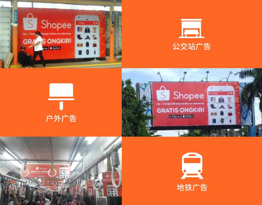 Shopee在印尼34个主要城市的地铁、公交站台和交通要道上投放了大量户外广告。这些城市包括印尼前3大城市首都雅加达、泗水、棉兰,以及旅游胜地巴厘岛。通过户外广告牌、地铁广告等,让用户一想到线上购物就想到Shopee。