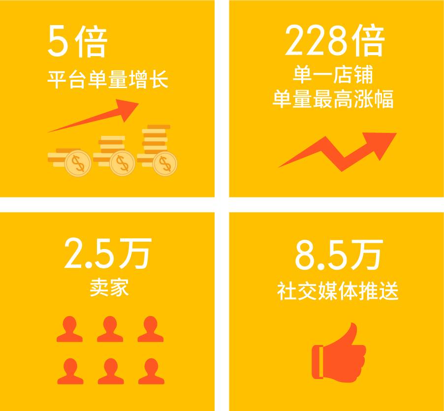 2016年9.9大促期间,平台单量增长5倍,社交媒体曝光了超过850万个推送,数万参与活动的店铺中,单量增长最高的达228倍。