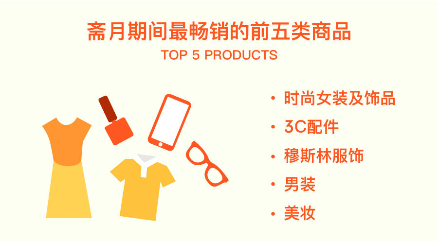 调研结果还显示了斋月期间网购搜索量排名前5的品类,它们分别是时尚女装及饰品、3C配件、穆斯林服饰、男装、美妆。几乎所有的用户都表示斋月期间非常满意自己所选的购物平台,后续会向亲朋好友推荐。