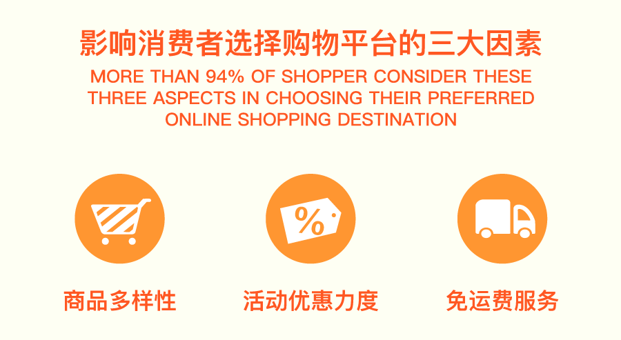 调查发现,超过94%受访者认为有三大因素影响他们对网购平台的选择,分别是商品的多样性、活动优惠力度以及免运费的服务。
