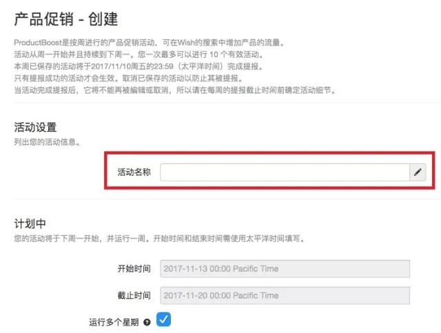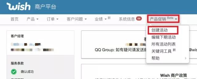 点击“Wish商户平台”顶部导航栏中的“产品促销”-“创建活动”,即可开始创建PB活动