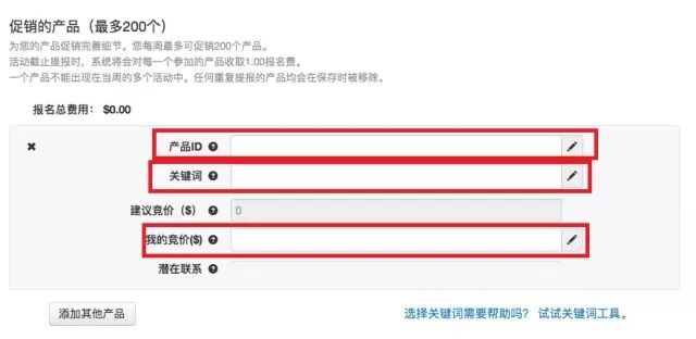 输入产品ID、产品进行ProductBoost推广的关键词,及该产品的推广竞价。一次活动可为多个产品进行推广设置。