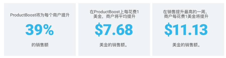 实验周期中,参加ProductBoost的商户,平均每个商户都获得了39%的销售额提升,在销售提升最高的一周,花费1美金获得了11.13美金的提升,提升效果显著。