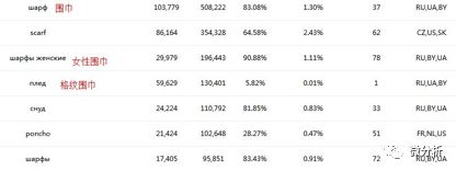 随着全球气温的不稳定变化,越来越多的人开始早早为保暖做准备。时尚配件类产品季节性非常明显。例如太阳镜的热卖季节为5-9月份,围巾的热卖季节为9月到次年2月。下半年开始到圣诞季正是围巾帽子的销售旺季。围巾类目已经进入旺季销售状态,包括超大围巾、披肩、斗篷等都是今年的热销款式。 一.报告导读: 1. 围巾/披肩市场在近90天的流量、交易都是上升的趋势,供需指数下降,市场需求扩大。 2. 俄罗斯、美国是围巾的最畅销的国家。 3. 女性围巾、格纹围巾等特定属性的关键词搜索量较高。 4. 物流快递上使用最多的是China Post Registered Air Mail(中国邮政挂号小包)。 5. 围巾总体评价较好,买家主要关注围巾柔软度和暖和度。 6. 提前宣传推广抢占季节性强的商品市场。 7. 格子围巾在围巾类型中最为热销,围脖是新型具有发展前景的围巾。