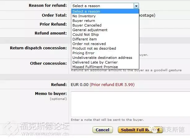建议选择买家取消;也可以根据实际情况选择退款原因,退款可选原因如下图(部分退款相同),需要注意的是:如果卖家选择的原因在于自身,ODR订单缺陷率扣分更多;如果不能选择买家的原因,建议选择General adjustment;
