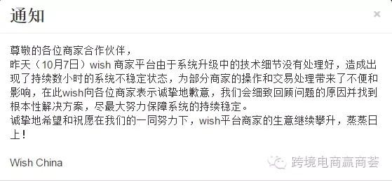 据赢商荟了解,wish官方第一时间作出回应称,之所以会出现这种情况,是因为Wish商家平台在系统升级中的技术细节没有处理好,造成出现了数小时的系统不稳定状态,为部分商家的操作和交易处理带来了不便和影响,在此Wish也向各位商家表示诚挚的歉意。