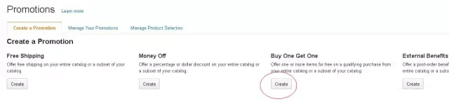 进入卖家后台,美国站点,在advertising下拉菜单中选择promotion,点击create,进入buy one get one 设置页面:(英国站点:在inventory下拉菜单中选择manage promotion,进入buy one get one设置页面)。