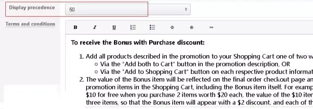 2、我们看到在最下方有一个display precedence(促销的优先级),此处可以进行修改,当我们同时做几个并存生效的促销时,在这里的数字大小并决定了我们促销的优先顺序,数字设置的越小,代表优先性越高!