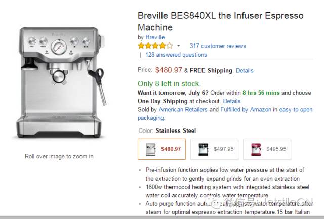 对于大多数亚马逊卖家来说,bargain是一种核心手段。例如,BrevilleInfuser Espresso Machine这款意式浓缩咖啡机,亚马逊一个月前标价说原价$800,打折后$500,《时代》周刊发表的47款打折家电生活用品里就有它。可是到了独立日周末再看这款产品时,亚马逊只告诉你现在售价$483,以至于那47款产品里,有19个不得不说明自己的产品以前售价更高,现在价格已是优惠状态。