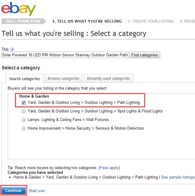 第三步:选择类目,选择正确的类目是宝贝能否获取优质流量的关键,一般我们输入正确的核心关键词之后,eBay会把最优类目默认在第一位,所以只要选择第一项即可,然后点击蓝色按钮进行下一步操作