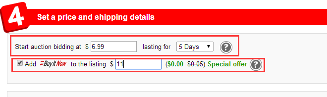 第八步:设置价格,第一排为竞价价格,设置一个起拍价,后面设置好竞拍时间。第二排为一口价。要合理控制好利润,运费和15%-20%的手续费。