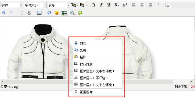 在编辑器内,您选中要编辑的图片,单击右键,即有四种图文混排方式(默认排版、图片居左、图片居中、图片居右)可供选择。如果您对排版的效果不满意,可以点击“重置图片”,将图片恢复默认的状态。