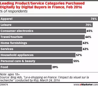 研究也发现74%的法国网购者购买最多的品类是衣服。其次是休闲用品,70%的网购者最常购买的是休闲用品。许多其他产品和服务也都通过网络购买了。大约2/3的网络用户在线预订旅游,至少55%的用户购买消费电子、家居用品、家电、健康美容产品以及其他服务。
