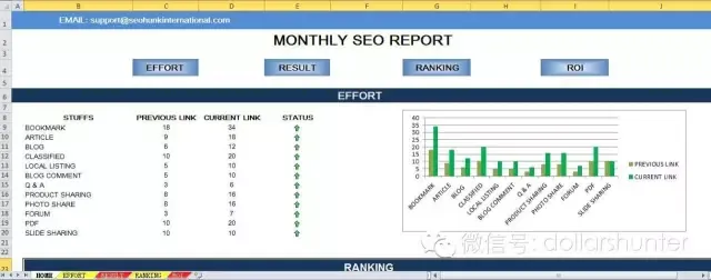4. 每月15日一份工作报告,包括链接、关键词排名情况等等一大堆图表数据,反正我也看不大懂。