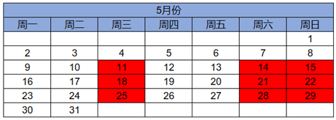 请留意5月份的第一个大促日将从5月11日开始,大促日共9天,如下表所示: