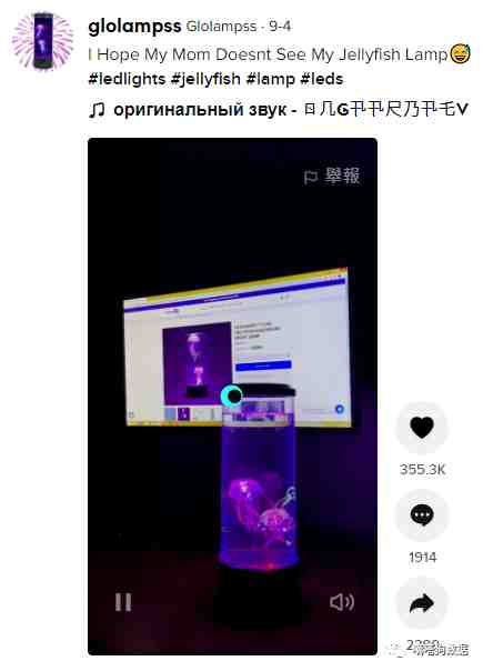 这位名为@glolampss的TikTok创作者在9-4发布的视频已经获得450万播放量,35万点赞,账号发布大部分视频都是在宣传该款水母灯。