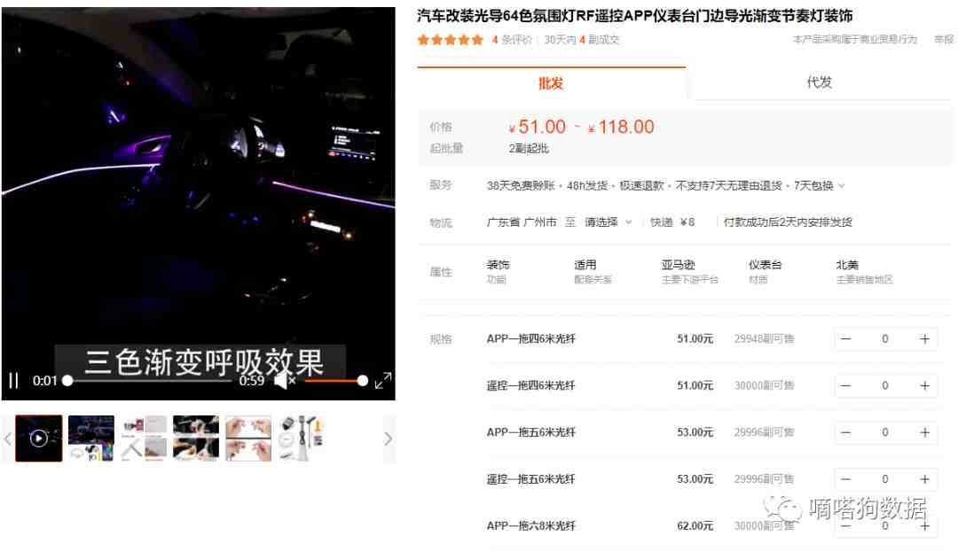 这款汽车LED氛围灯在独立站售价为34.99美金,而在国内1688上搜可以搜到类似产品,普通款标价为51元,具体配置为变色+APP控制+线长6米。