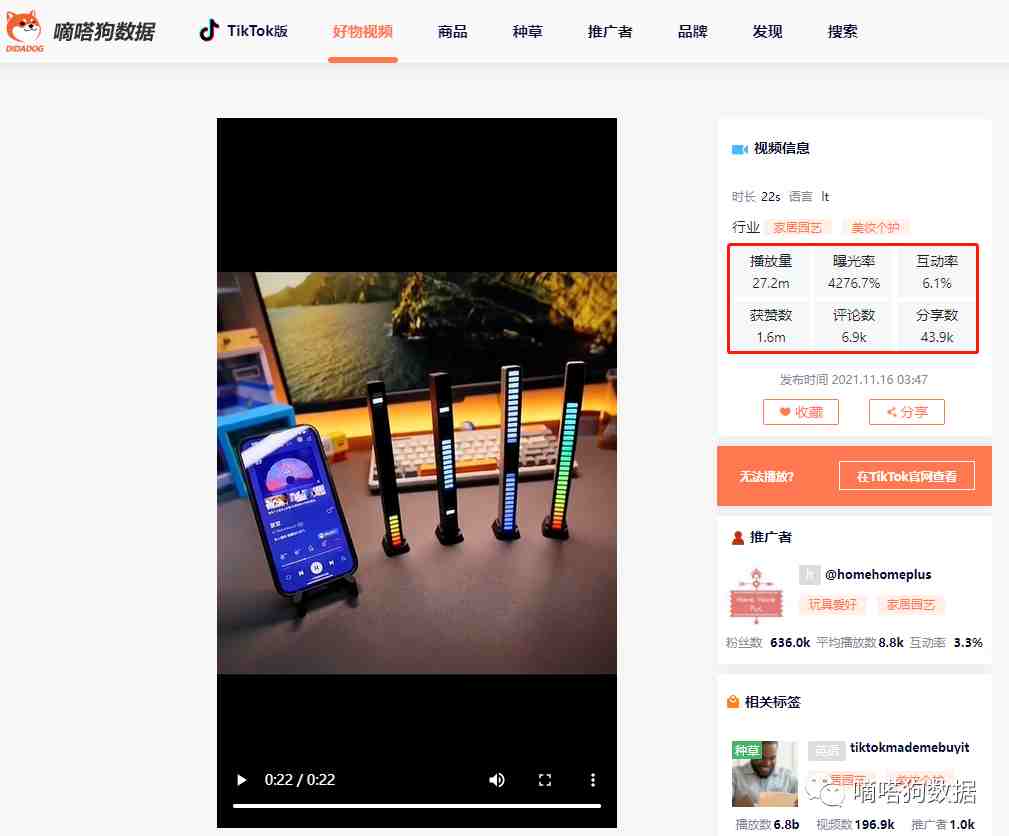 视频是博主@homehomeplus在11-16日发布,嘀嗒狗数据显示目前累计获得数据:播放量2720万,点赞数160万,评论数6900条,分享数4.3万。大量用户在评论区询问产品详细信息,包括名称、售价以及购买方式,证明这款产品吸引力非常受欢迎。