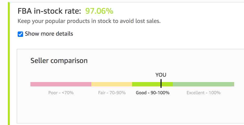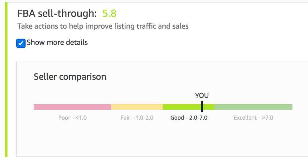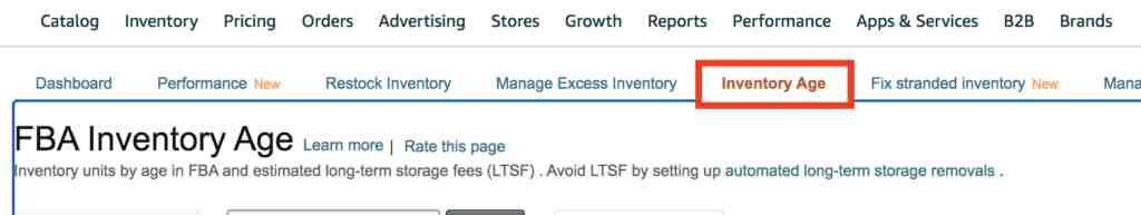 卖家可以在卖家中心的库存仪表板的 "库存年限 "(Inventory Age)的位置看到每个在售产品的销售率。